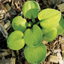 Dense mound of thick, heart shaped medium gold leaves; pest resistant. Pale purple flowers in mid summer. Plant in partial sun, or light shade all day. Dwarf hosta.