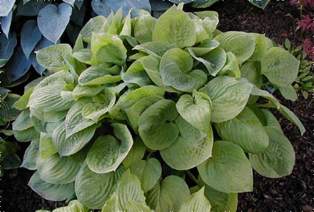 Heart shaped, seersuckered & puckered, bright creamy gold. Rich purple with violet striped flowers in late summer. Bright gold in sun, chartreuse in shade. Plant in partial sun to full shade. Medium size hosta.