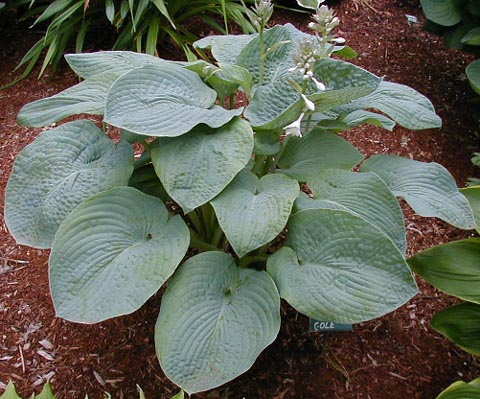 Very large & thick, shiny & seersuckered blue leaves held horizontally with white undersides; Pest resistant. Huge white flowers in mid to late summer. Plant in afternoon to full shade. Giant hosta.