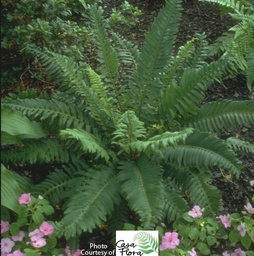 Unusual fern with glossy green, thick, narrow dissected fronds with 8 to 10 pairs terminating pinnea edged with unusual protrusions. Semi-stoloniferous rhizomes. Plant in afternoon to full shade in well drainedsoil. Height: 36”. Zones 7 to 10. Semi-Evergreen