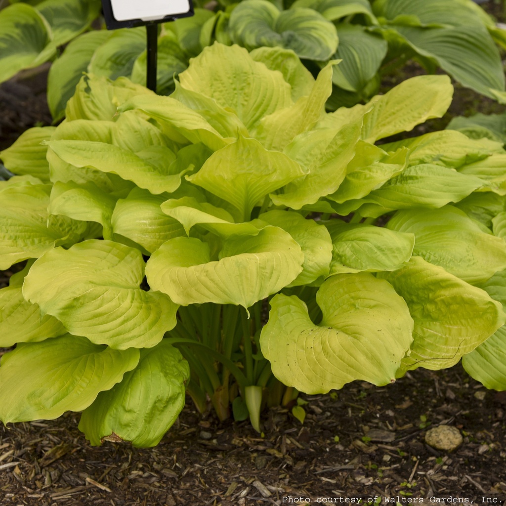 Wonderful, upright & thick, bright satiny lemon yellow, gently wavy leaves with deeply impressed veins. Near white bell shaped flowers in late summer. Plant in partial to nearly full shade. Giant hosta.